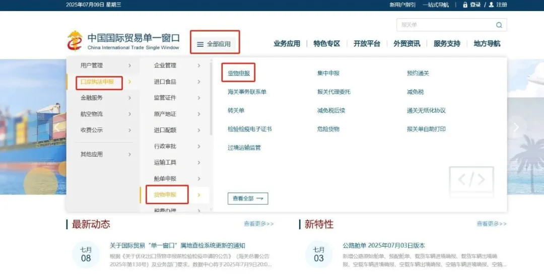企业通过卡介质(IC卡或USB key)方式登录“中国国际贸易单一窗口”,依次点击:全部应用—口岸执法申报—货物申报—货物申报。