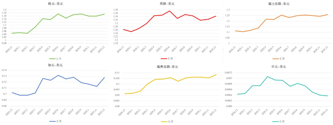 主要发达经济体货币对美元呈现显著升值趋势。虽然美元作为国际贸易计价货币和全球储备核心,但过去一年美国特朗普政府推出“对等关税”,引发市场对美国经济的担忧,动摇了美元的避险资产地位,导致美元对主要发达国家货币体系表现弱势,创下自2017年以来的最大年度跌幅。据统计,美元对一篮子主要货币(即美元指数,欧元、日元、英镑、加元、瑞典克朗、瑞士法郎)全年下跌约9.5%,除日元外,其余主要货币升值明显。