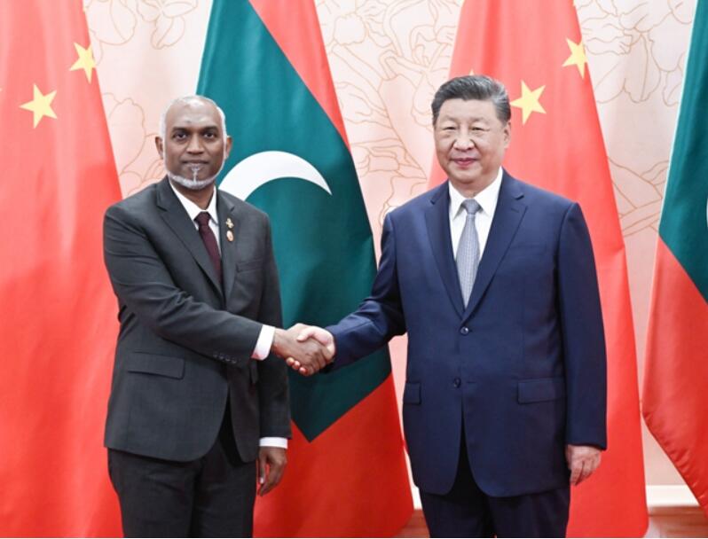 8月31日上午,国家主席习近平在天津迎宾馆会见来华出席2025年上海合作组织峰会和纪念中国人民抗日战争暨世界反法西斯战争胜利80周年活动的马尔代夫总统穆伊兹。