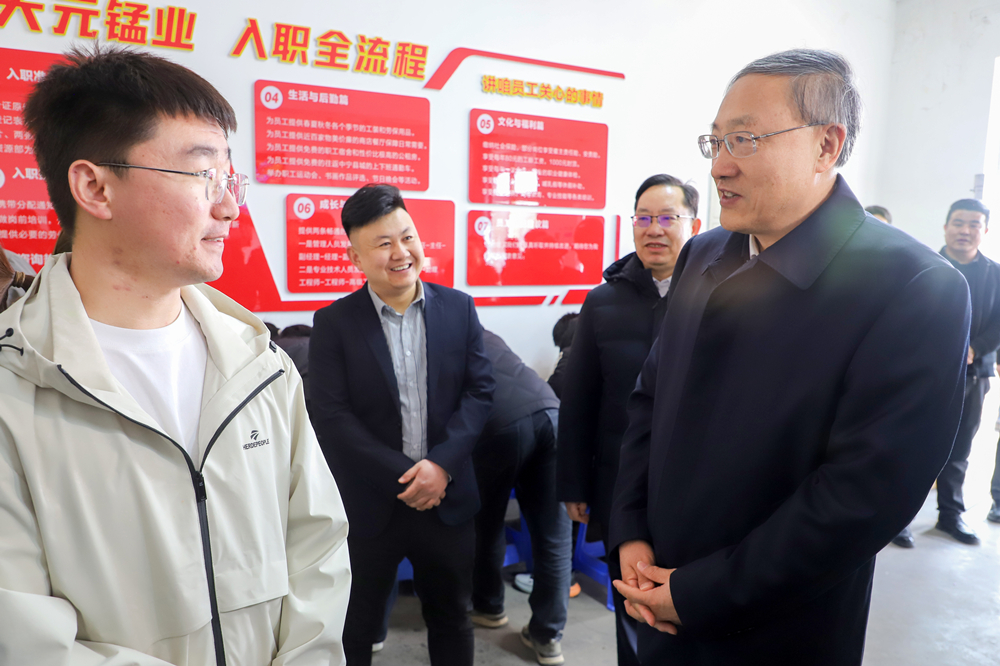 李邑飞随机走访宁夏天元锰业集团,在企业招聘现场同应聘人员交谈,察看电解锰迁建技改项目建设进展,与企业管理人员、市县负责同志等座谈交流,勉励企业坚持稳中求进,着力稳增长、稳生产、稳投资、稳市场、稳就业、稳预期,积极防范化解各类风险,开好局、起好步;坚持规划引领,推进产品结构优化、绿色低碳转型和数字化改造,强链补链延链,推动锰基产业集群发展;坚持深化改革,建立健全现代企业制度,以高效治理赋能高质量发展。在宁东基地宝丰能源四期烯烃新材料项目现场,李邑飞调研项目推进情况,叮嘱各级各部门坚持和落实“两个毫不动摇”,坚定不移促进民营经济发展壮大、扶持民营企业做优做强,加大要素保障,强化政策支持,提升服务效能,努力创造民营经济健康可持续发展的良好环境。