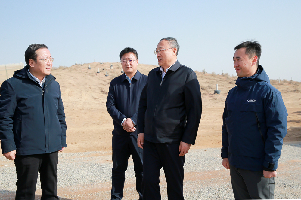 李邑飞在吴忠市利通区扁担沟镇,调研宁夏国储新能源公司400MW农光互补光伏发电项目建设情况。吴忠市新闻传媒中心记者 谷刚/图