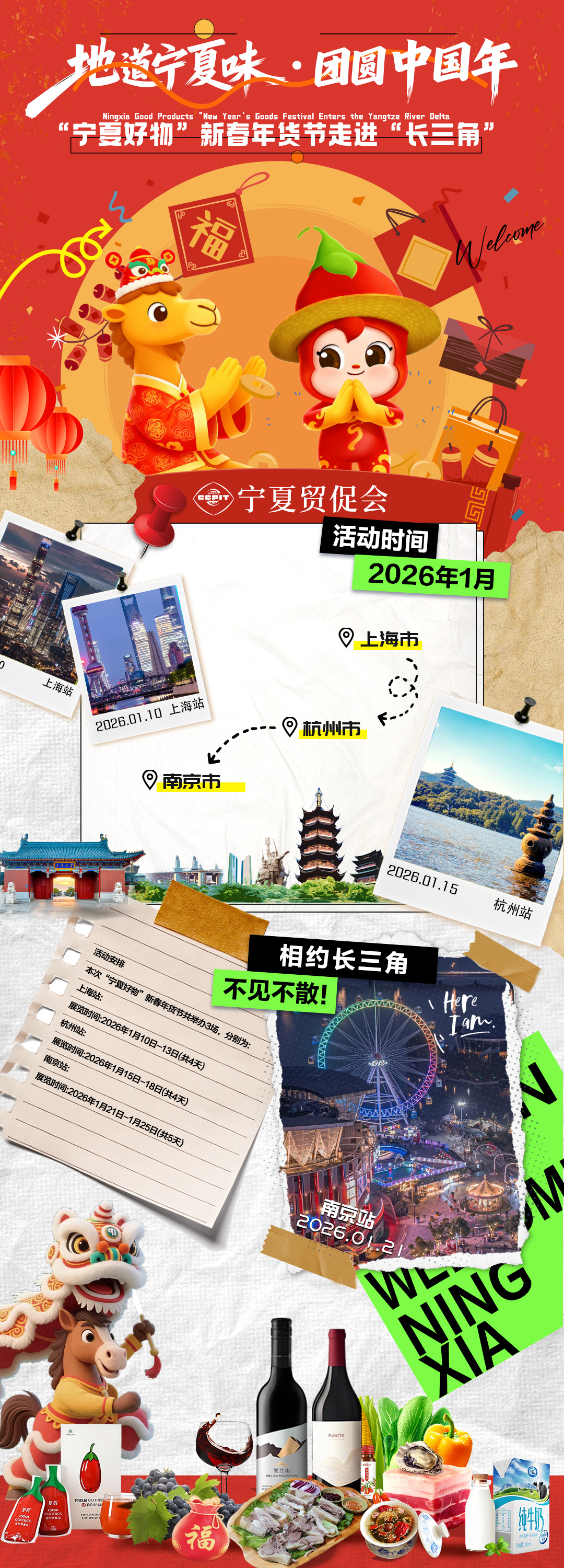 为深入贯彻落实自治区党委、政府有关“稳增长促发展攻坚年”的决策部署,充分借助春节前人流与消费高峰有利时机,面向长三角销售宁夏好物、推广宁夏品牌,深化我区与长三角地区的贸易合作交流,助力企业延链补链、促销增收,宁夏贸促会采取巡展的方式,定于2026年1月,在上海、杭州、南京举办“宁夏好物”新春年货节走进长三角活动,同期在宁夏贸促会官网、微信公众号等平台设置线上年货节专题,打造“一站式”年货采购销售新场景。